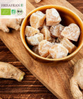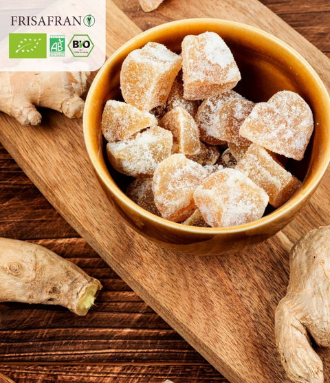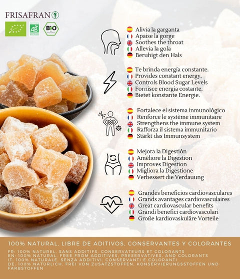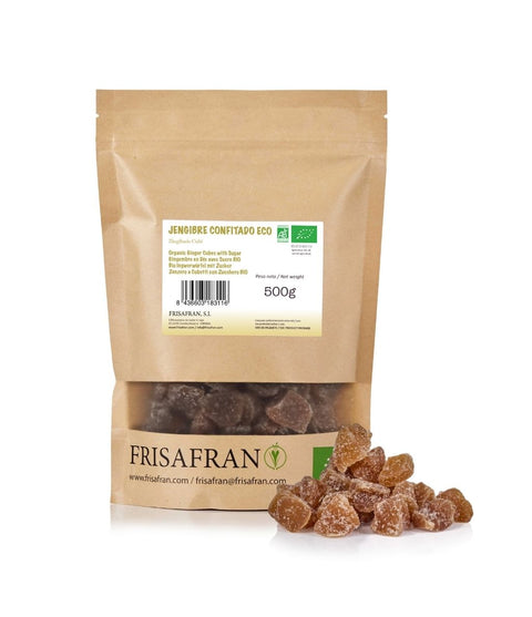 Frisafran |¡Descubre el poder del jengibre ecológico en cada bocado! Nuestros dados de jengibre, cultivados de forma sostenible y recubiertos con azúcar orgánica, ofrecen una explosión de sabor y una variedad de beneficios para tu salud.