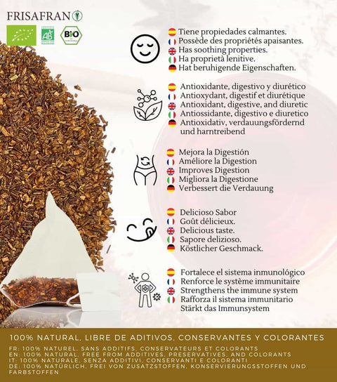 ☕ Producción 100% natural, ecológica y artesanal. No irradiado o genéticamente modificado. Consumelo frío o caliente, puedes disfrutar de la tranquilidad sin los efectos de la teína con nuestro té de rooibos, perfecto para momentos de relajación y calma.