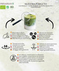 Nuestro producto procede de agricultura ecológica, donde no se usan aditivos artificiales ni colorantes. Usamos hojas de té verde cultivadas de forma sostenible y molidas siguiendo métodos tradicionales que ayudan a preservar su aroma, sabor y propiedades naturales.